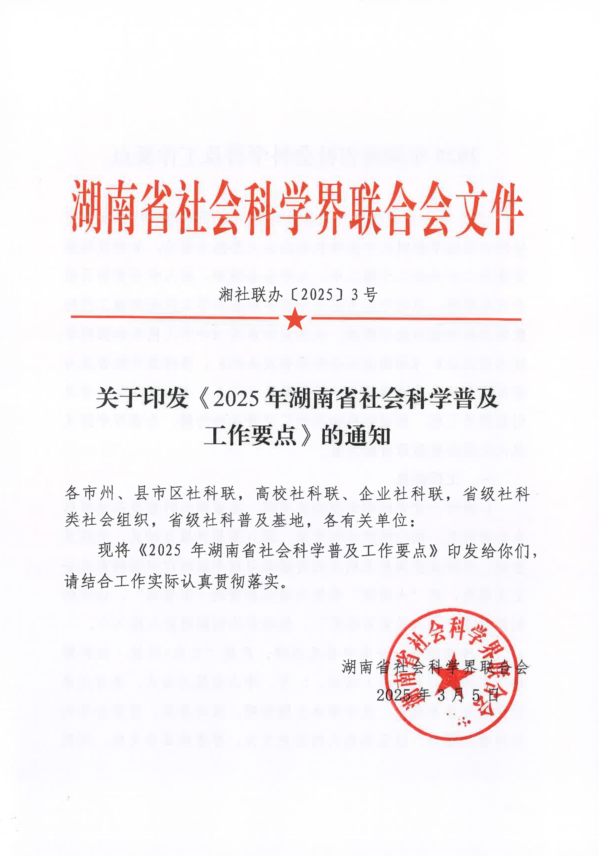 2.积极申报项目。为适应零基预算和专项经费绩效管理要求,2025年湖南省社科普及工作探索项目申报制,鼓励各单位积极申报社科普及活动周(月)启动式、湖湘大学堂·名家讲坛、社科普及优秀成果评选、社科普及创新活动等项目,要确保申报项目主题突出、内容详实、方式创新、覆盖面广,提升社科普及的影响力和实效性。